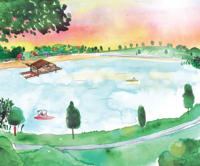 Our concept art showcases the incredible potential of the pond, from peaceful fishing spots to a future floating dock and boat rentals. Imagine gliding across the water in a small electric boat, canoe, or kayak, taking in the breathtaking surroundings of our 80+ acre resort. It’s the perfect way to “Discover Memories Together™” with your loved ones.