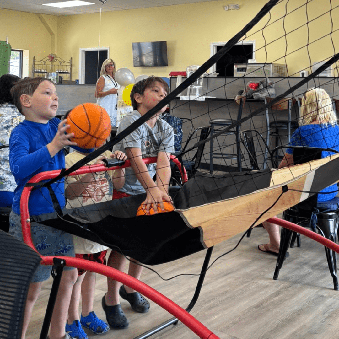 Rain or shine, you’re covered. Kids rotate between playground, lawn games, and indoor activities. Adults stay comfortable while connected to the action.